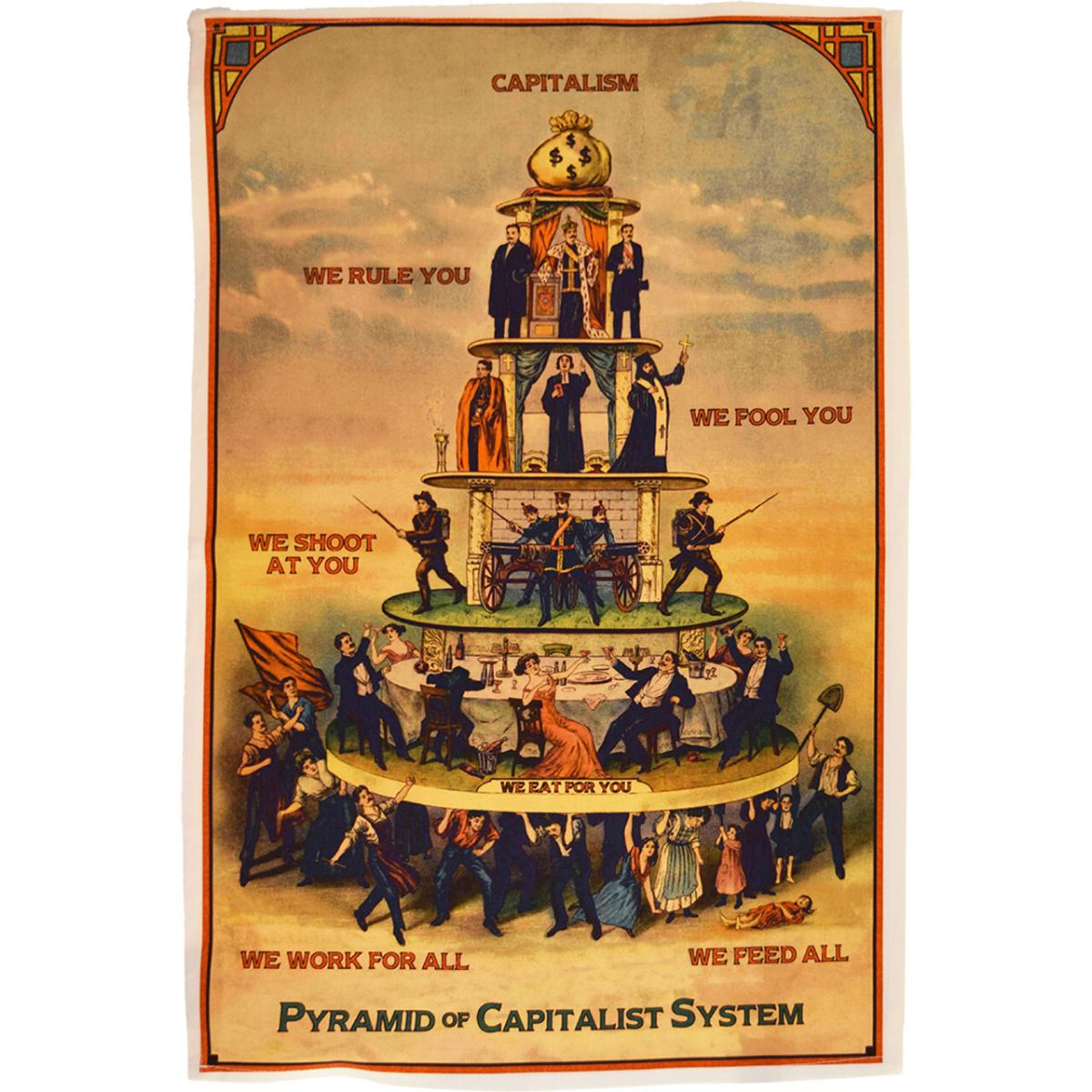 Our new Pyramid of Capitalism tea towel, inspired by a 1911 cartoon from the Industrial Worker, a publication of the IWW