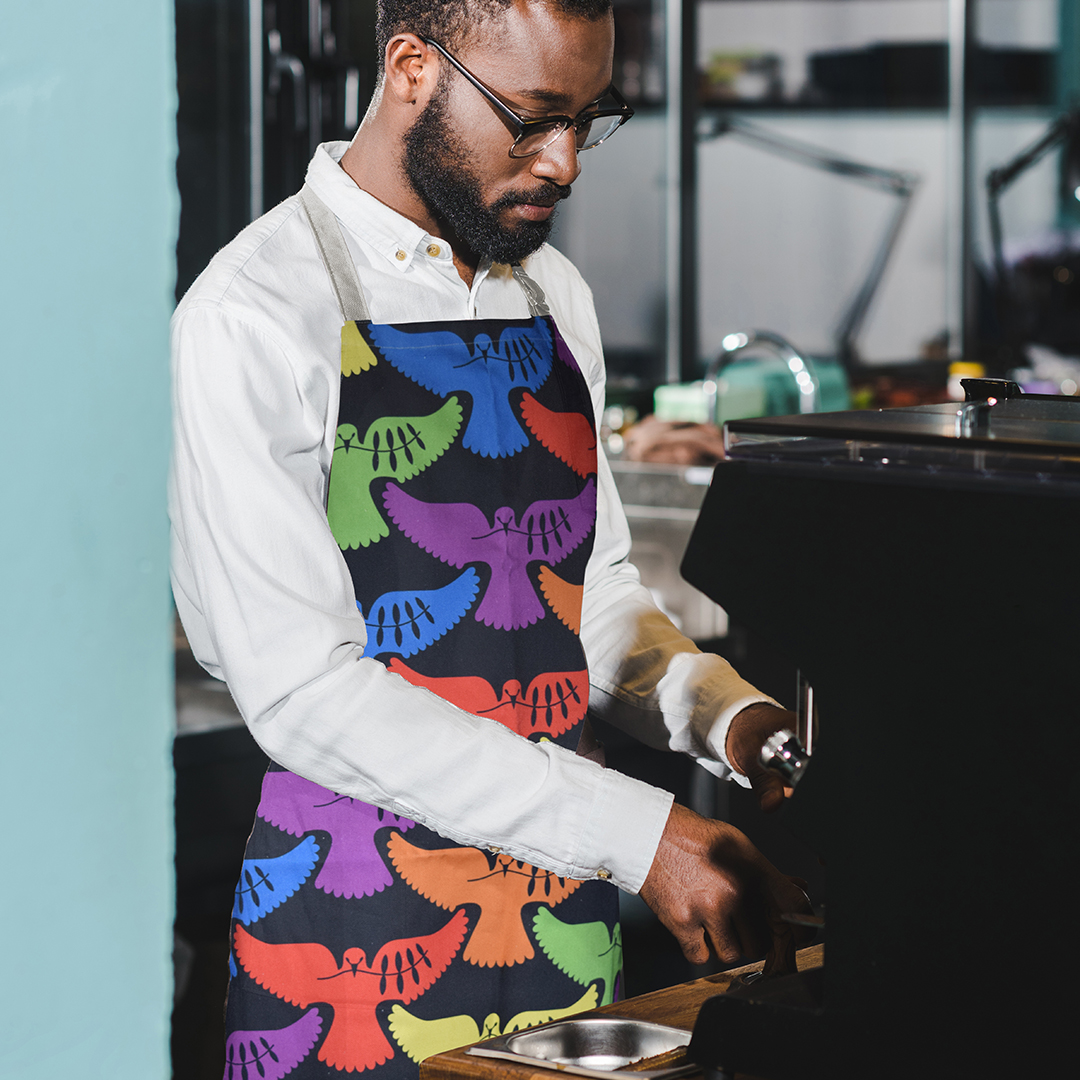 A full or ‘bib’ apron is the most popular and common type. It covers the chest and loops or ties at the back then ties at the waist, just like these radical aprons.